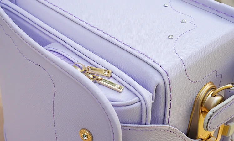 やさしい色合いのゴールドの金具、ファスナートップにもストーンが輝きます。